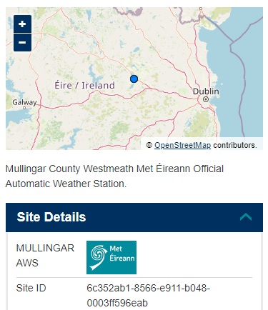 WOW-IE displays the observations from Met Éireann's Automatic Weather Stations (AWS) and our Automatic Climate Stations (ACS). This will be indicated by our logo and details on the station's View Full Observation page in the Site Details, see the example below. The values on the map come from the half-hour report from each of those stations. Click View Full Observations - Data Display to obtain further raw observations. Data download from these stations is not permitted because the data has undergone minimal quality controls filtering. The download of quality-controlled data from our AWS sites and voluntary climate stations is available from our Met.ie website here.